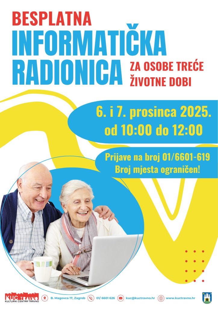 U Kulturnom centru Travno održati će se besplatna radionica pod nazivom „Informatička radionica za osobe treće životne dobi“. Program je namijenjen isključivo osobama treće životne dobi. Osobe treće životne dobi na ovoj radionici upoznati će se sa osnovama rada na računalu. Na radionici će polaznici kroz praktične primjere naučili koristiti Windows, kreirati i upravljati dokumentima i datotekama, pohranjivati podatke na računalo te pregledavati fotografije i video zapise. Osobe treće životne dobi upoznati će se sa služenjem interneta i pregledavanjem elektroničke pošte. Informatička radionica važna je za sve koji žele biti u korak s vremenom. Voditelj informatičke radionice je Jurica Lihtar, informatičar i vanjski suradnik.