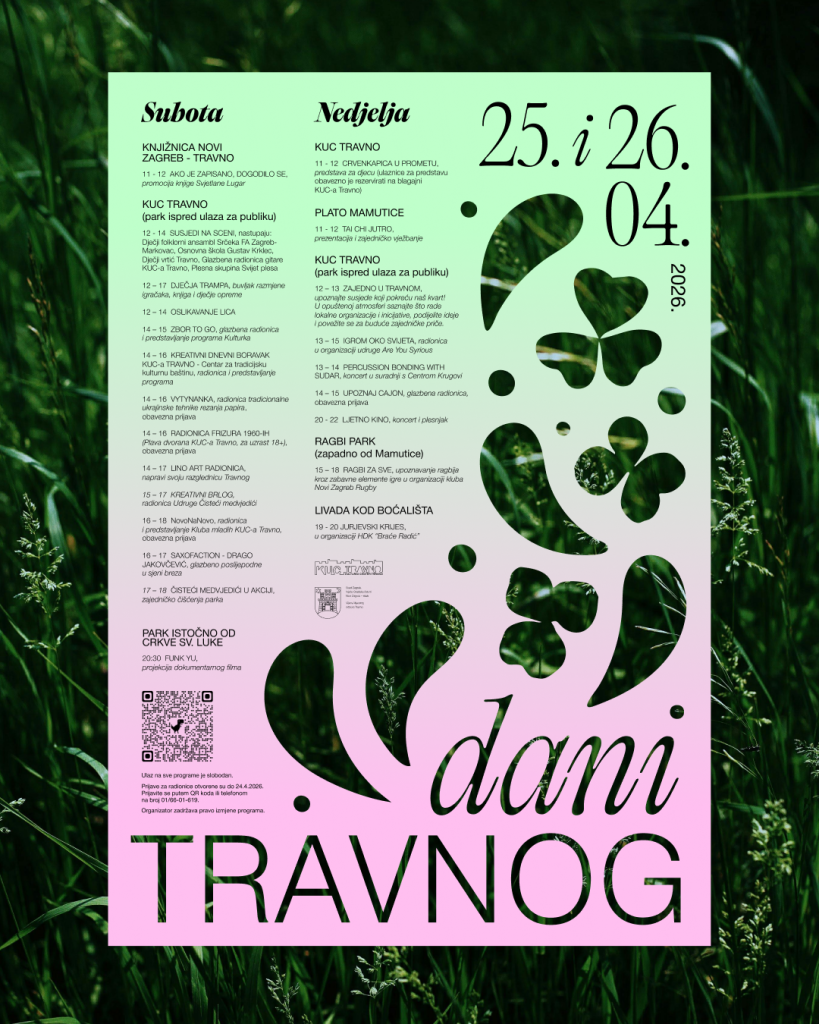 Rezervirajte vikend za Dane Travnog kada naš kvart postaje mjesto susreta, druženja i zajedničkog stvaranja. Očekuju vas nastupi djece iz kvarta, koncerti saxofonista i percussionista, razne kreativne radionice, upoznavanje sa sportom ragbijem, buvljak razmjene igračaka i knjiga, predstave, promociju knjige, projekciju filma te Jurjevski krijes, uz druženje i upoznavanje susjeda, lokalnih inicijativa i razmjenu ideja. Koncert Ljetnog kina, benda koji donosi hitove različitih razdoblja i stilova, savršen je za ples i veselo zatvaranje Dana Travnog.