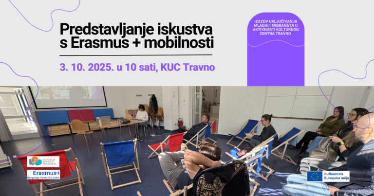 U petak, 3. listopada u 10 sati, u Plavoj dvorani KUC-a Travno, održali smo završno izlaganje Erasmus + projekta pod nazivom “Izazov uključivanja mladih i migranata u aktivnosti Kulturnog centra Travno” (2024-1-HR01-KA122-ADU-000222189) koji je financiran iz programa Erasmus+, Ključna aktivnost 1 za područje obrazovanja odraslih.